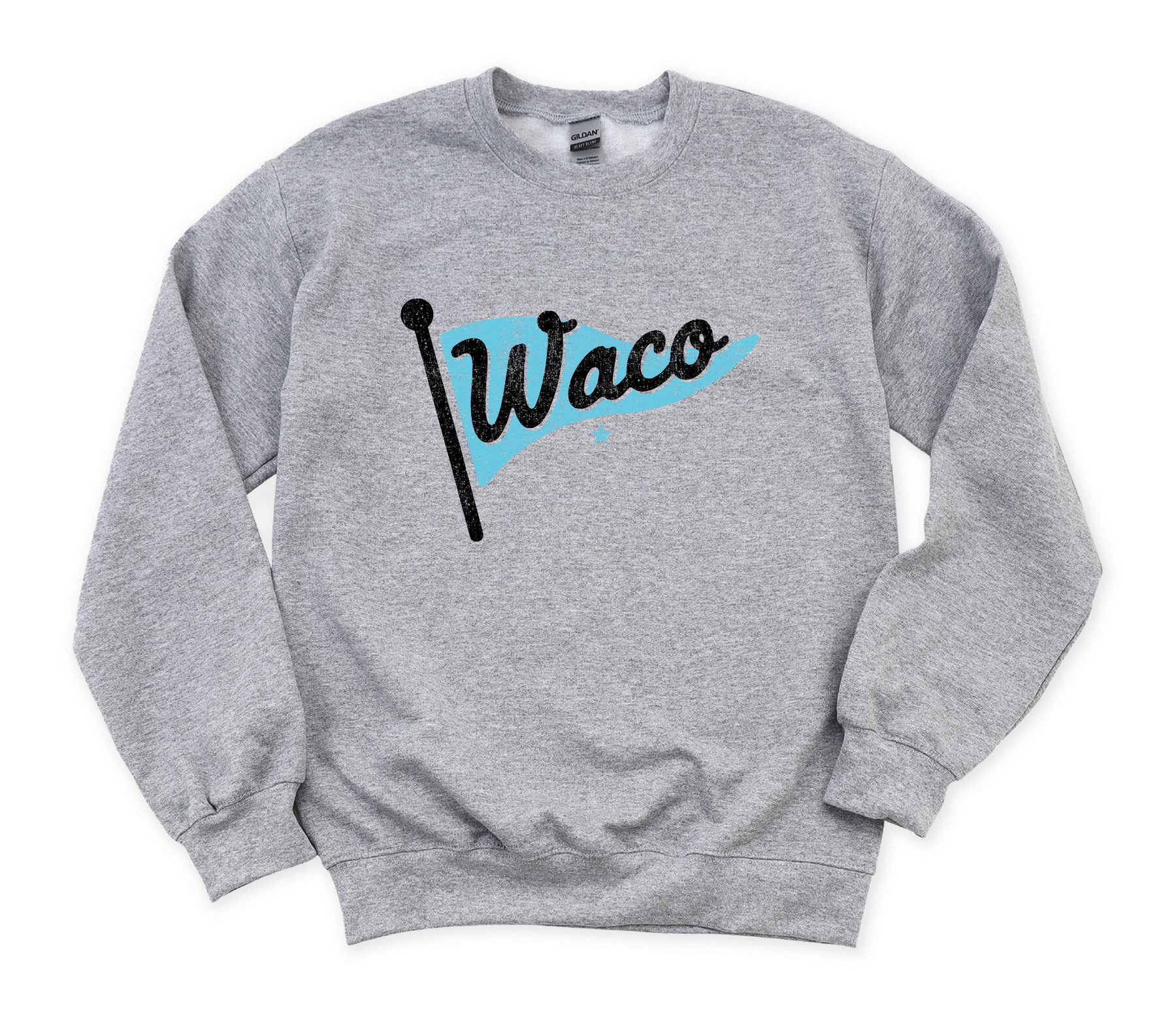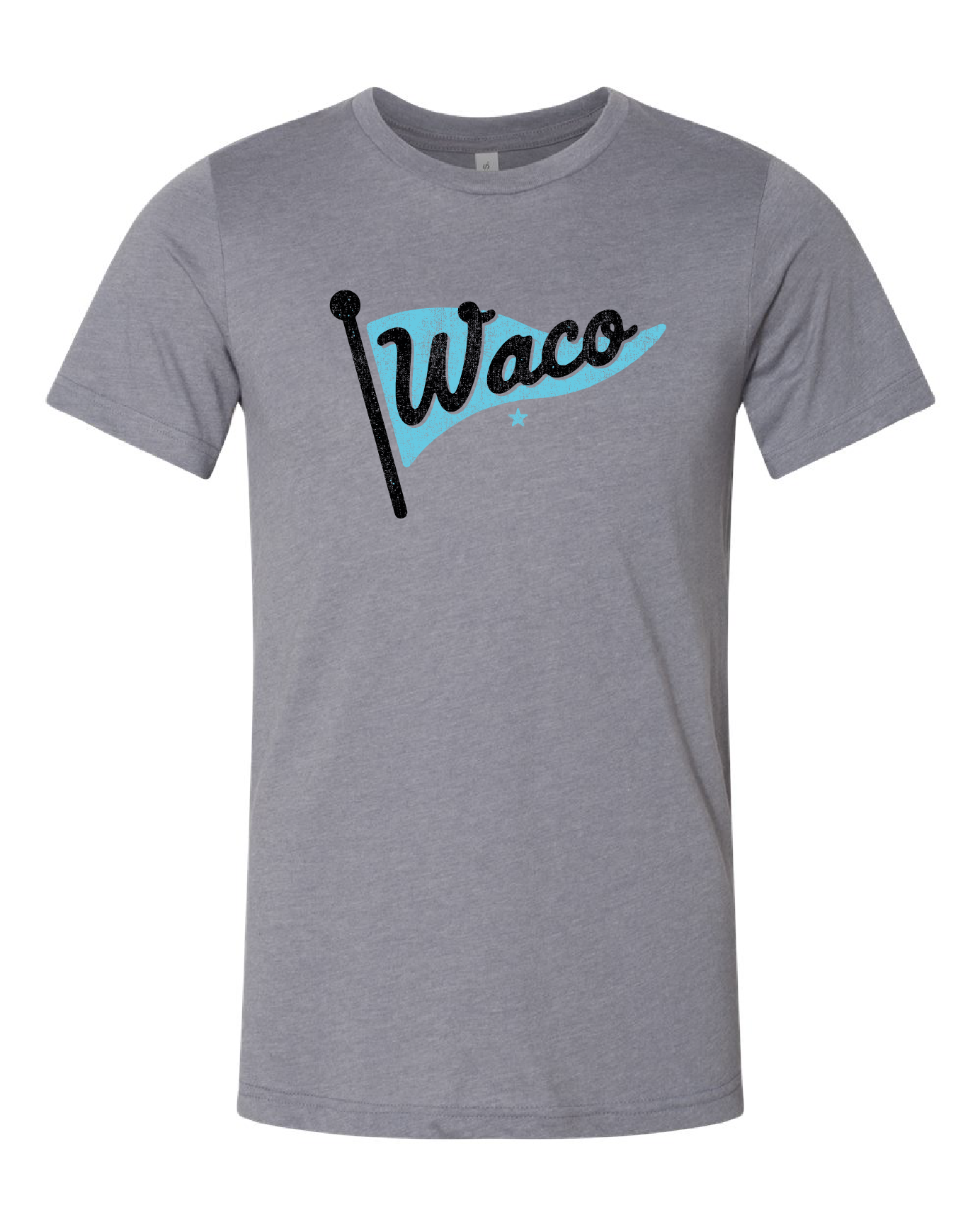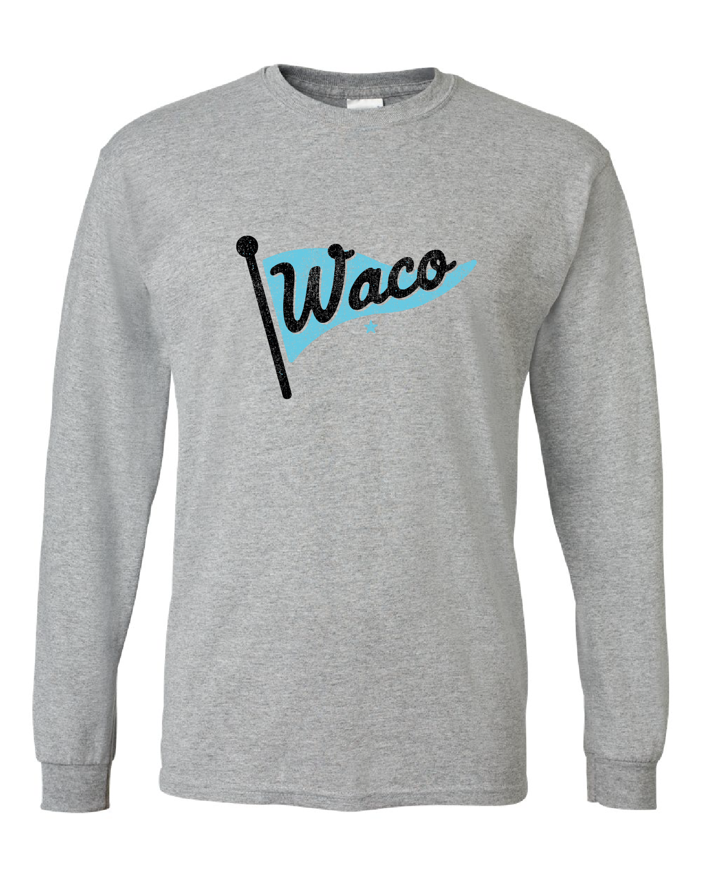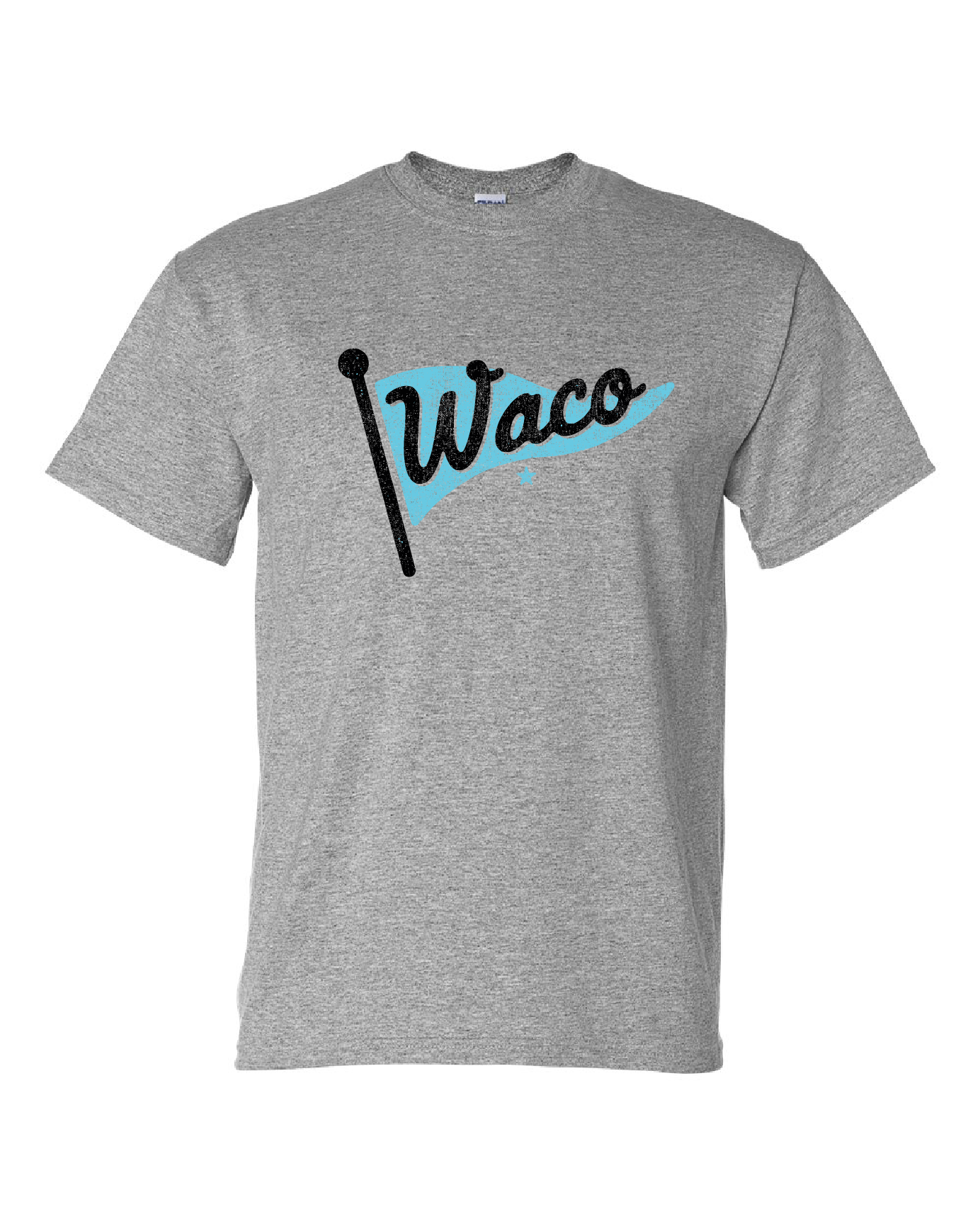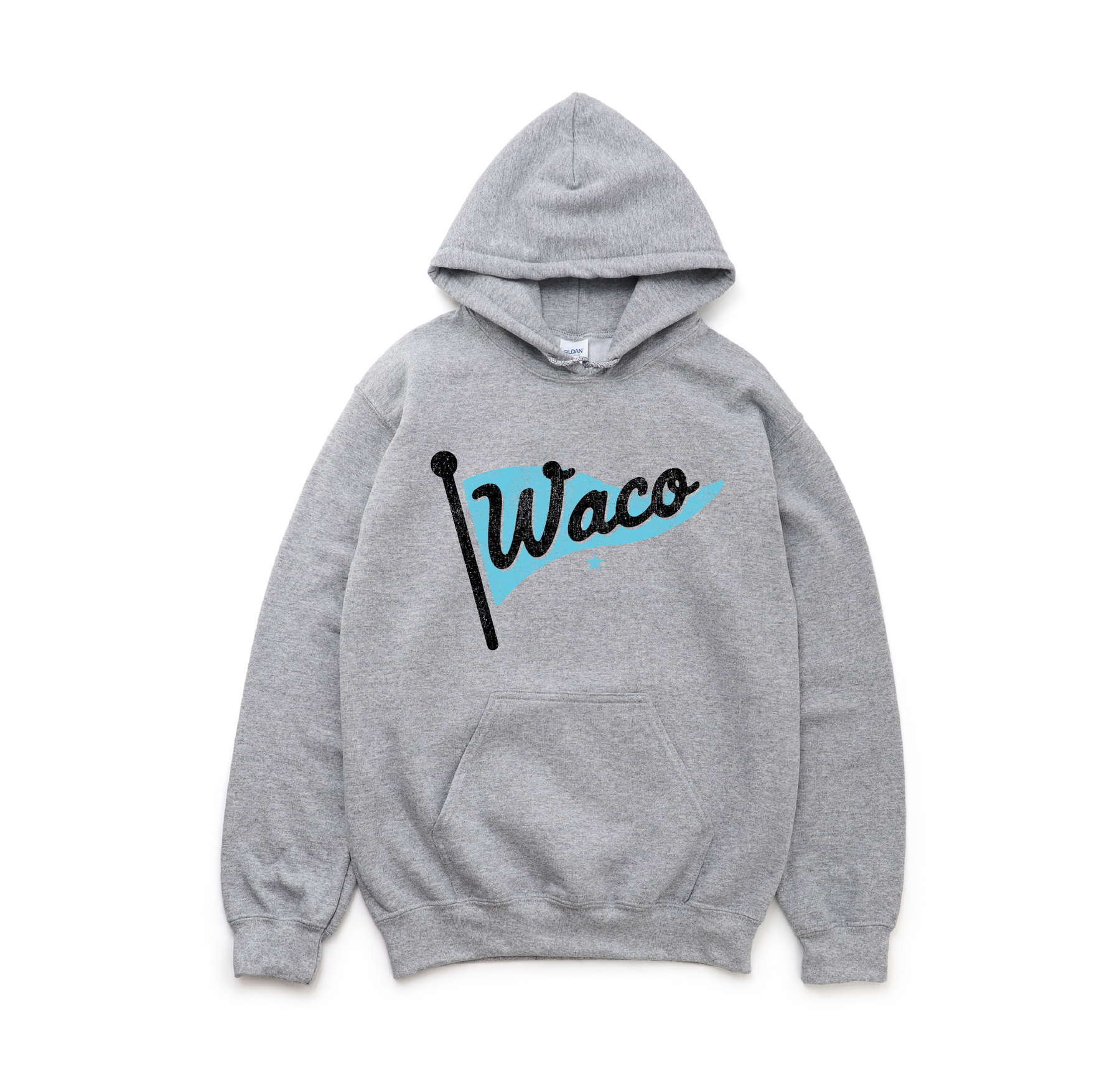 Our WACO Pennant design features a timeless flag graphic with bold script lettering and a subtle distressed finish for that perfectly worn-in, old-school feel. It’s the kind of design that never goes out of style — whether you’re cheering from the stands, walking the halls, or repping WACO around town.